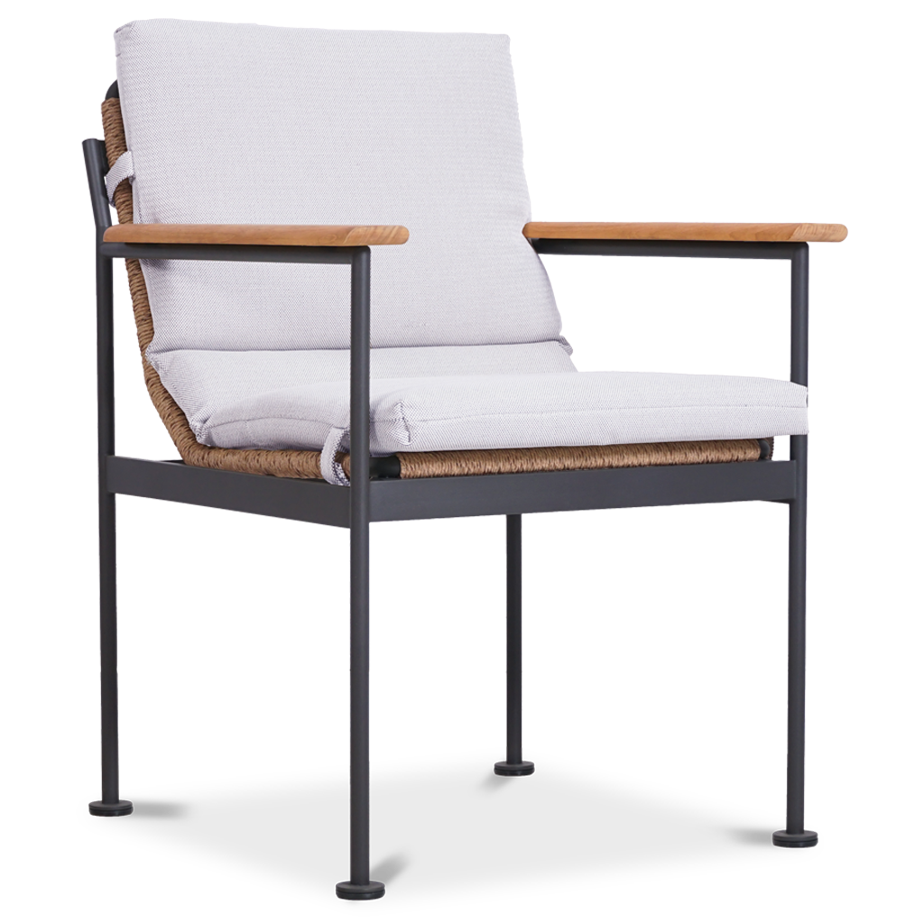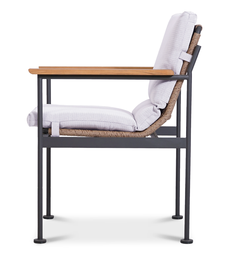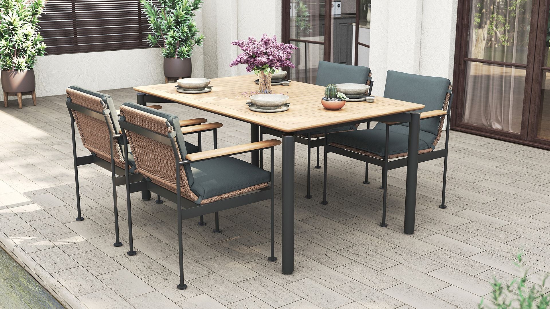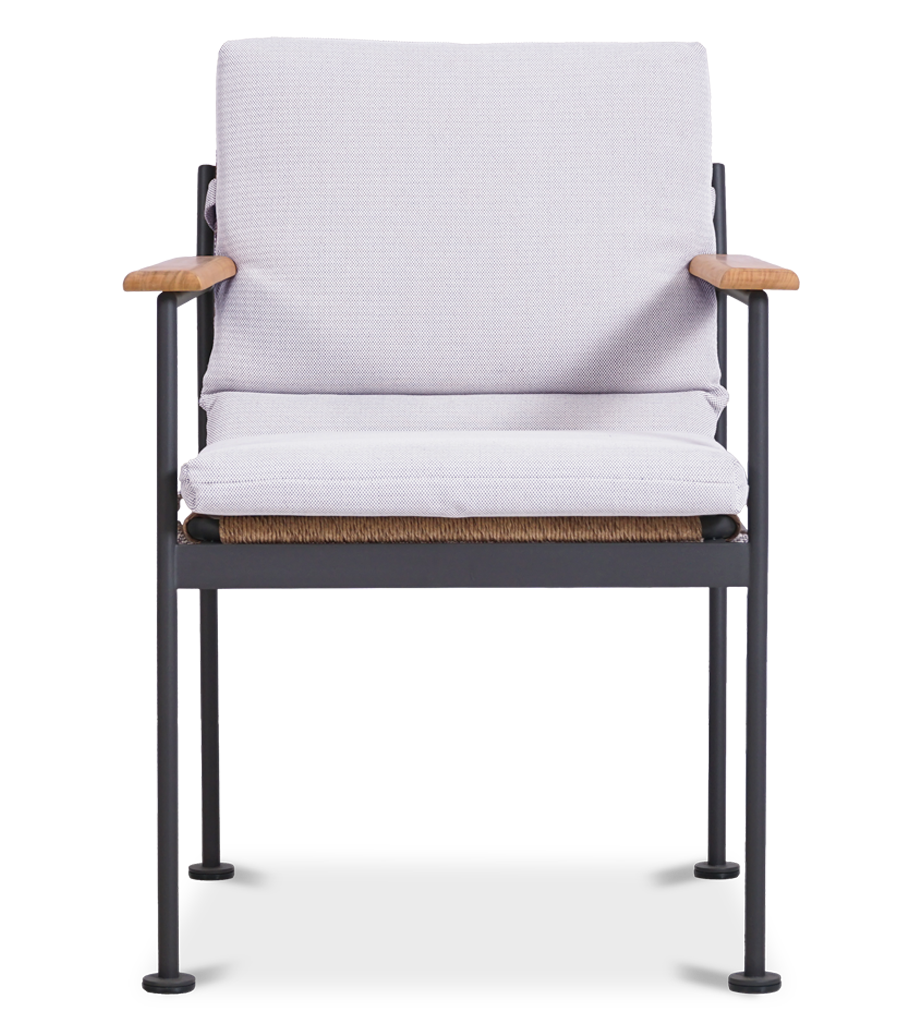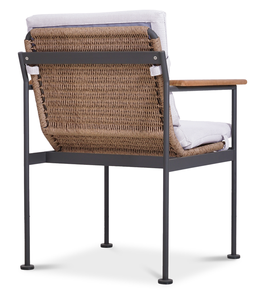 Crafted with a powder-coated stainless steel frame, it’s built to withstand the sun, rain and whatever the weekend throws at it. The handwoven back detailing brings character, and the quick-dry cushions are there to keep things cosy without the fuss. It’s dining done right, stylish, sturdy and surprisingly snug.