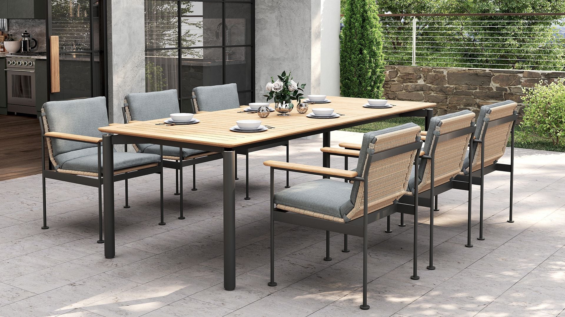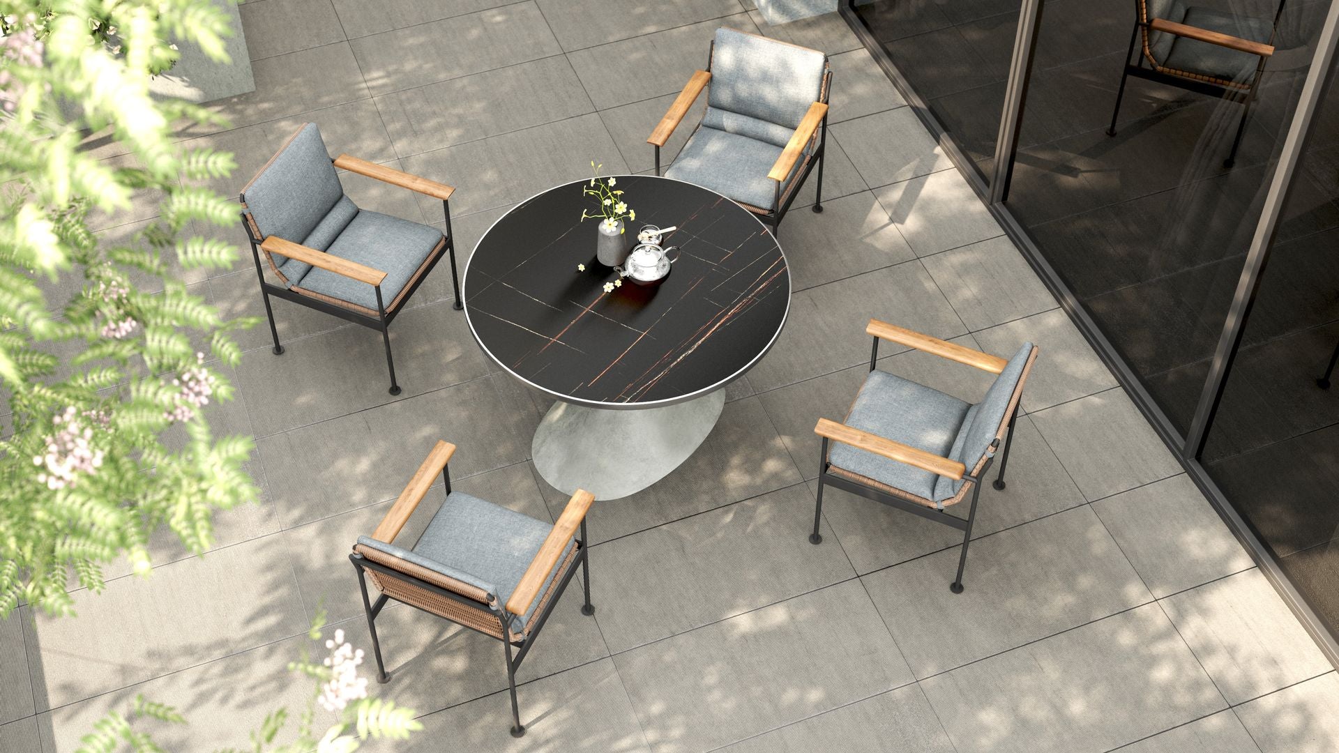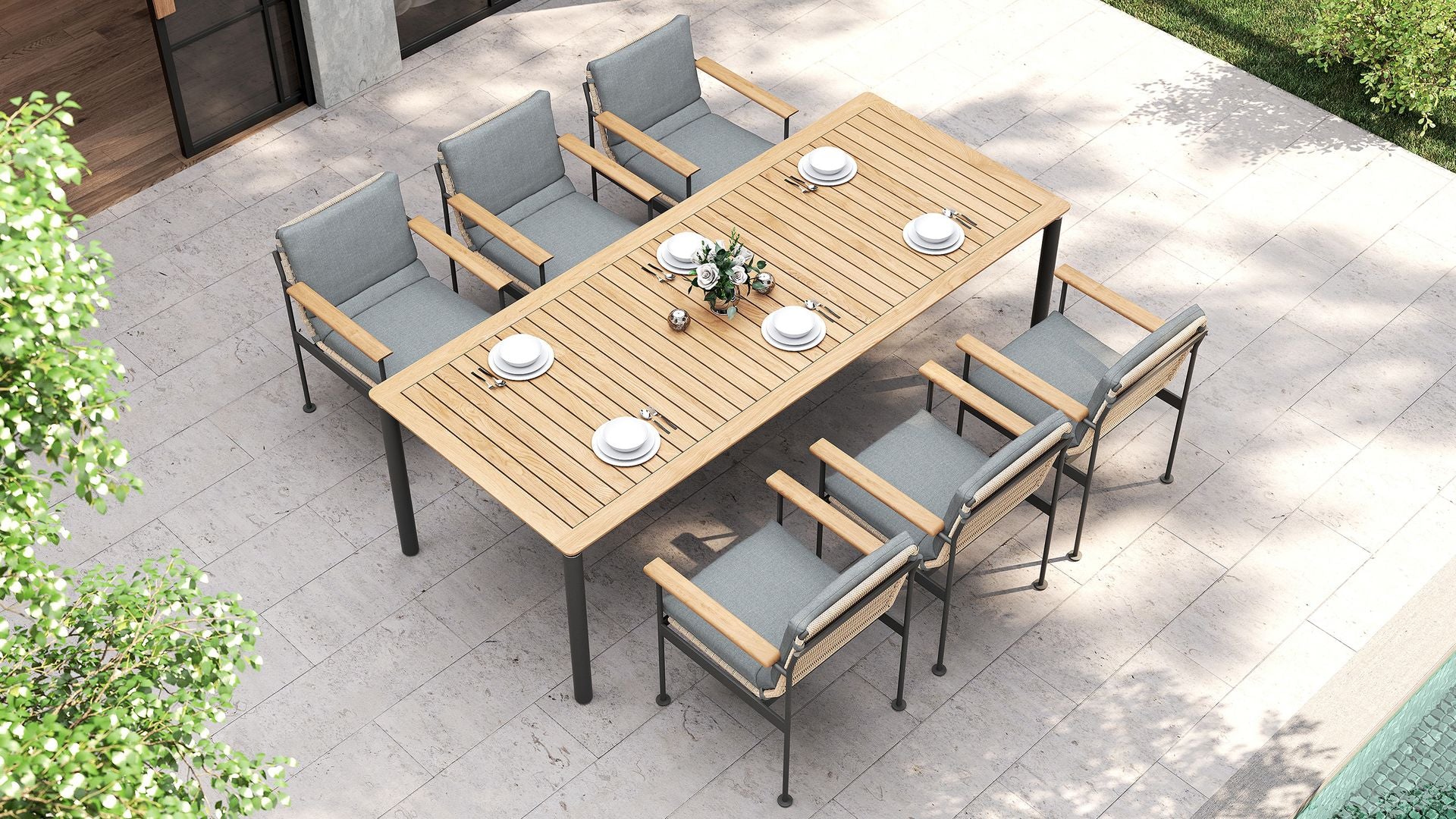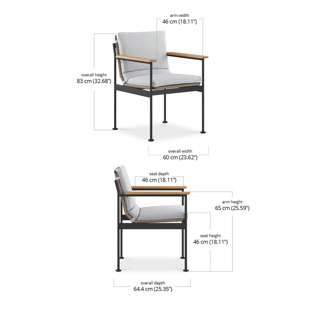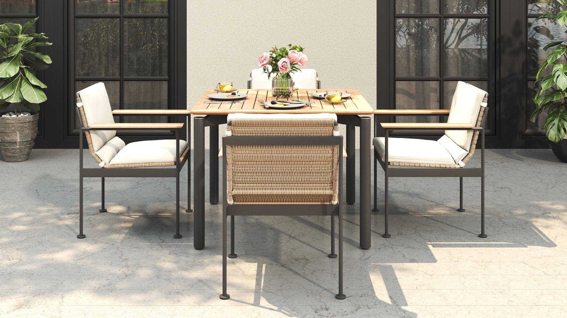 Crafted with a powder-coated stainless steel frame, it’s built to withstand the sun, rain and whatever the weekend throws at it. The handwoven back detailing brings character, and the quick-dry cushions are there to keep things cosy without the fuss. It’s dining done right, stylish, sturdy and surprisingly snug.