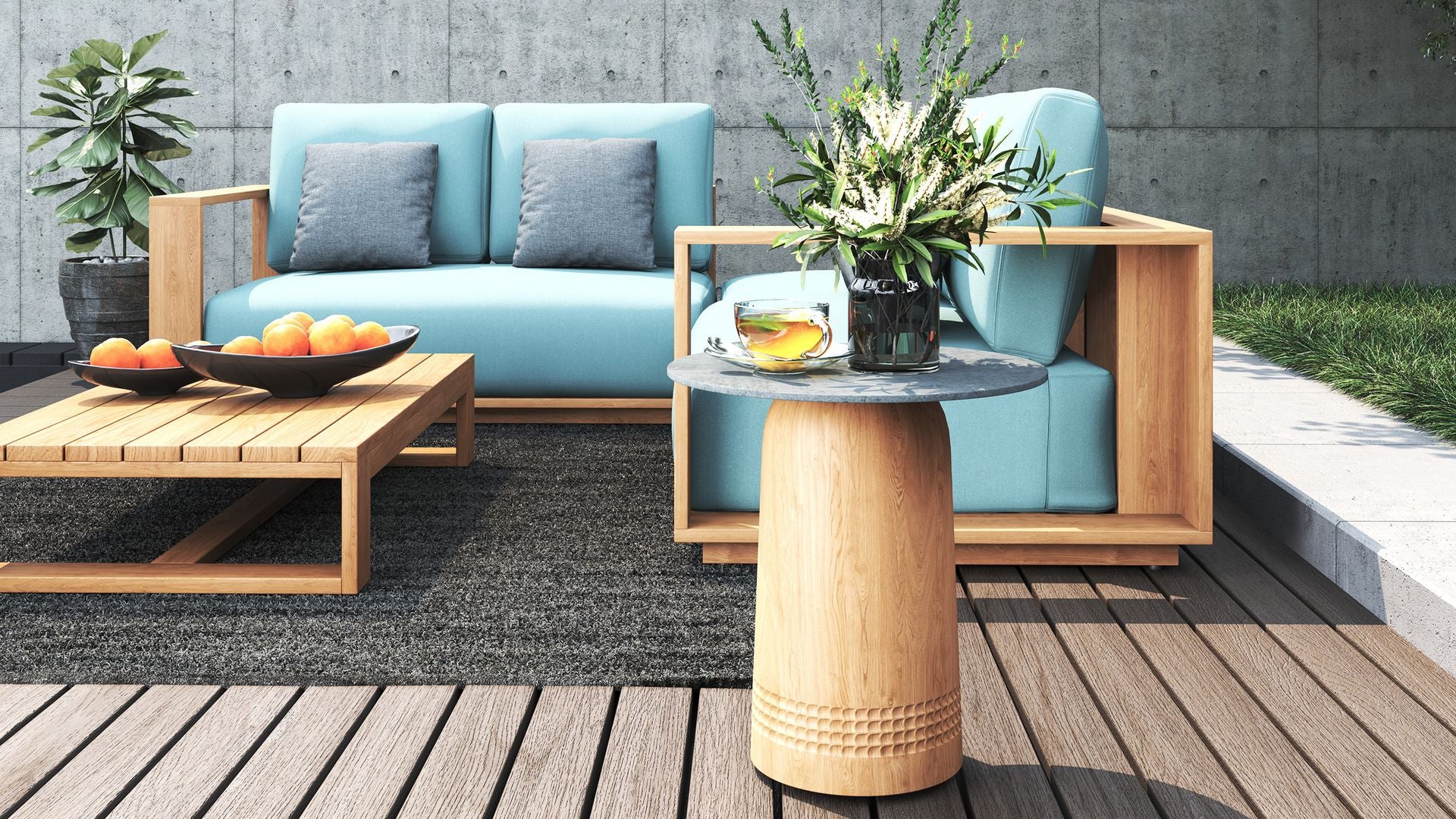 Each piece is handcrafted from solid teak and finished with deep, quick-dry cushions that are as comfortable as they are durable. The Sunbrella fabric is made from high-performance acrylic, offering superior fade resistance, water repellence and a soft, inviting feel. It’s one of the best choices for all-weather outdoor living.