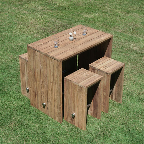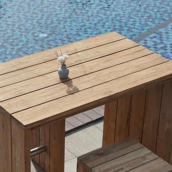 The clio bar table brings a quiet kind of drama to your outdoor setup. Built from reclaimed teak, it wears its history proudly, with natural imperfections, rich grain variation and tones that tell their own story. No two pieces are ever the same. That’s exactly the charm.