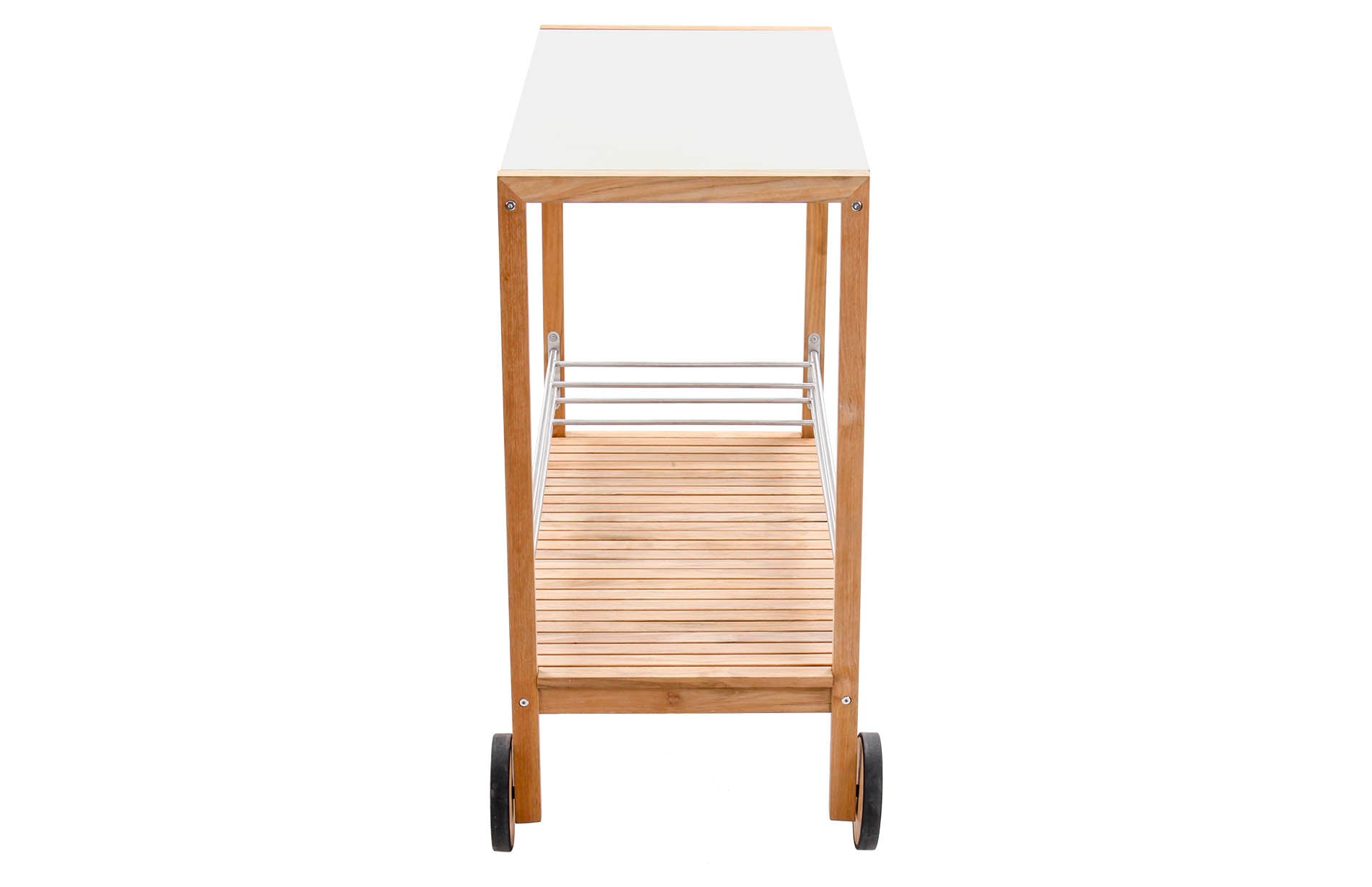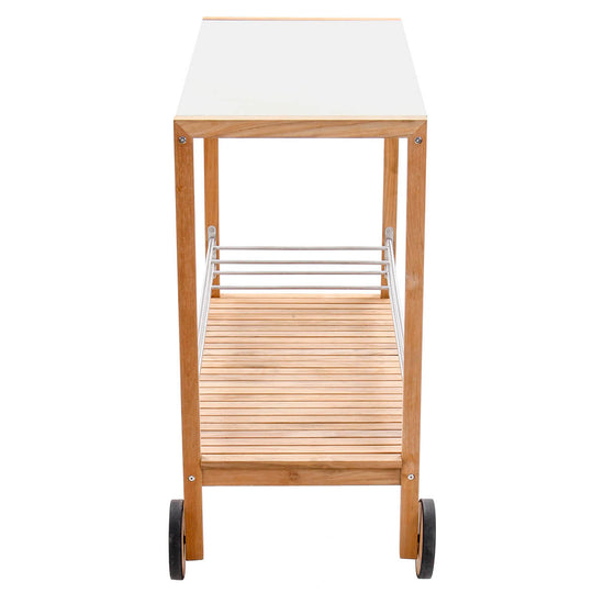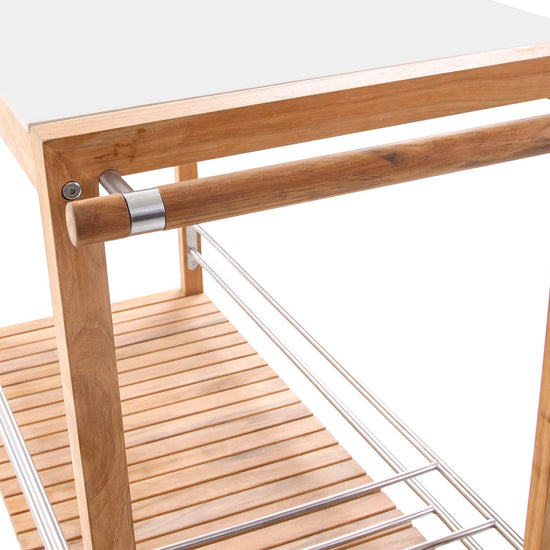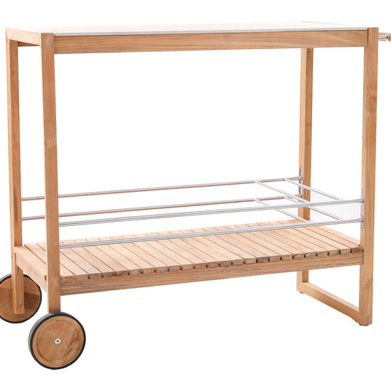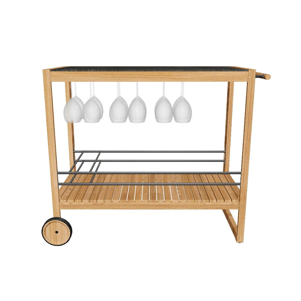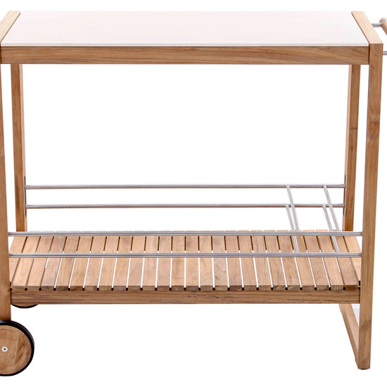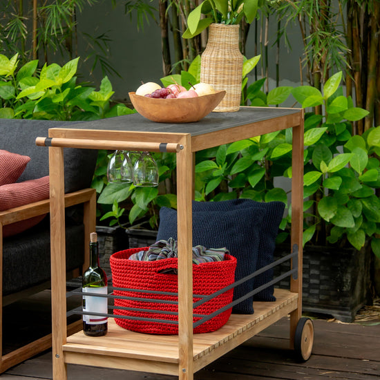 The colada trolley brings effortless function to your next gathering, indoors or out. Crafted with a solid teak frame and a ceramic top, it’s equal parts practical and refined. The slatted teak shelf offers breathable storage, while customisable powder-coated aluminium bottle holders and wine glass hooks keep your essentials in place. With a smooth side handle and rubber-rimmed teak wheels, it moves wherever the party goes.