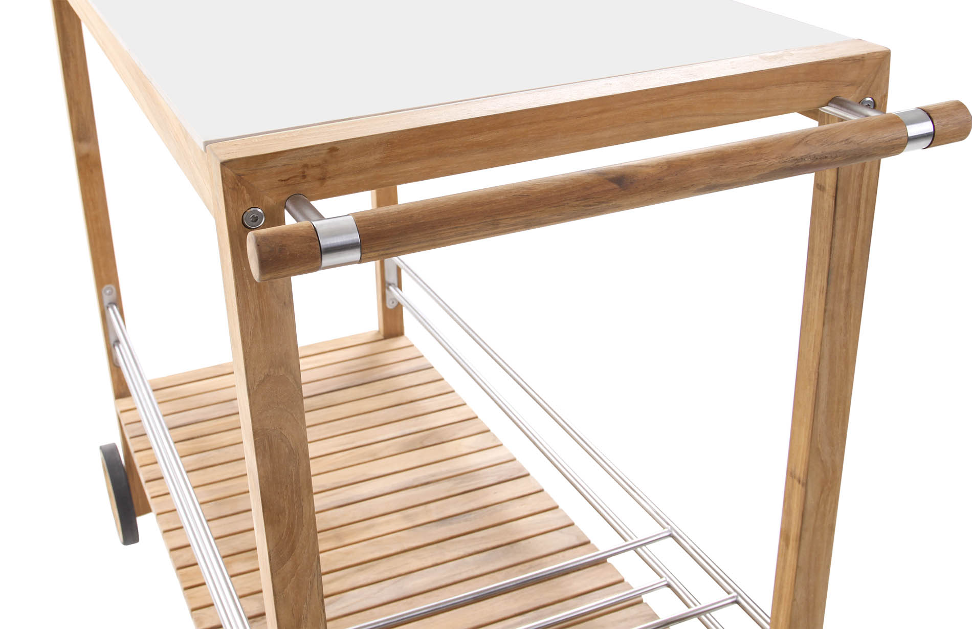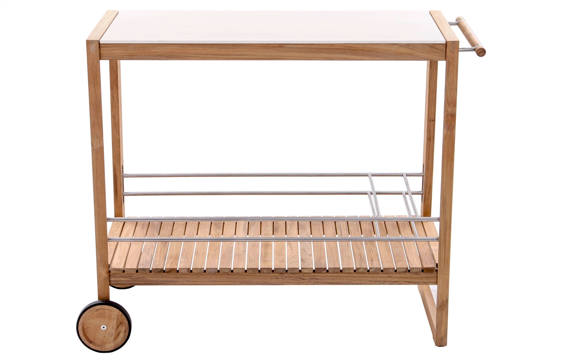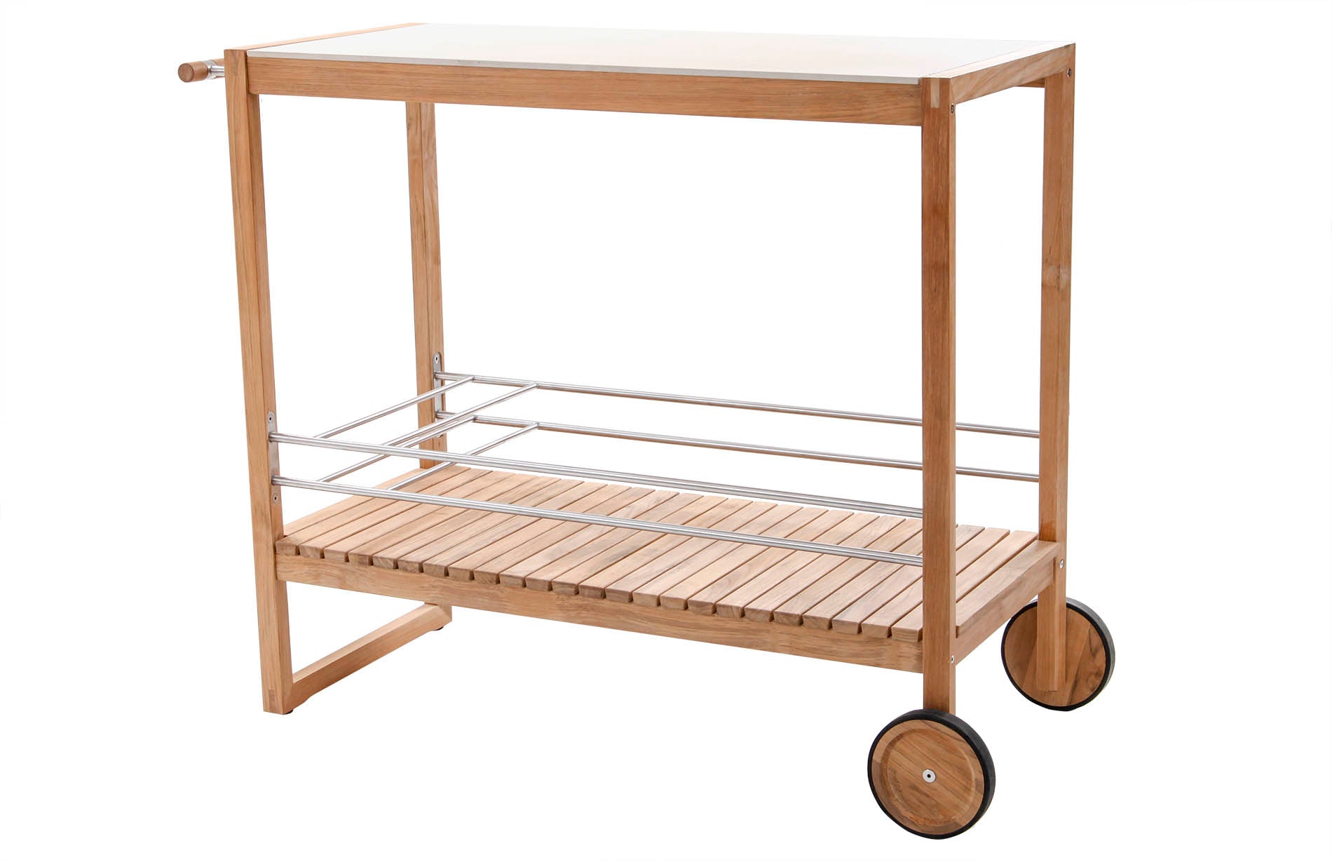 The colada trolley brings effortless function to your next gathering, indoors or out. Crafted with a solid teak frame and a ceramic top, it’s equal parts practical and refined. The slatted teak shelf offers breathable storage, while customisable powder-coated aluminium bottle holders and wine glass hooks keep your essentials in place. With a smooth side handle and rubber-rimmed teak wheels, it moves wherever the party goes.