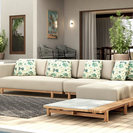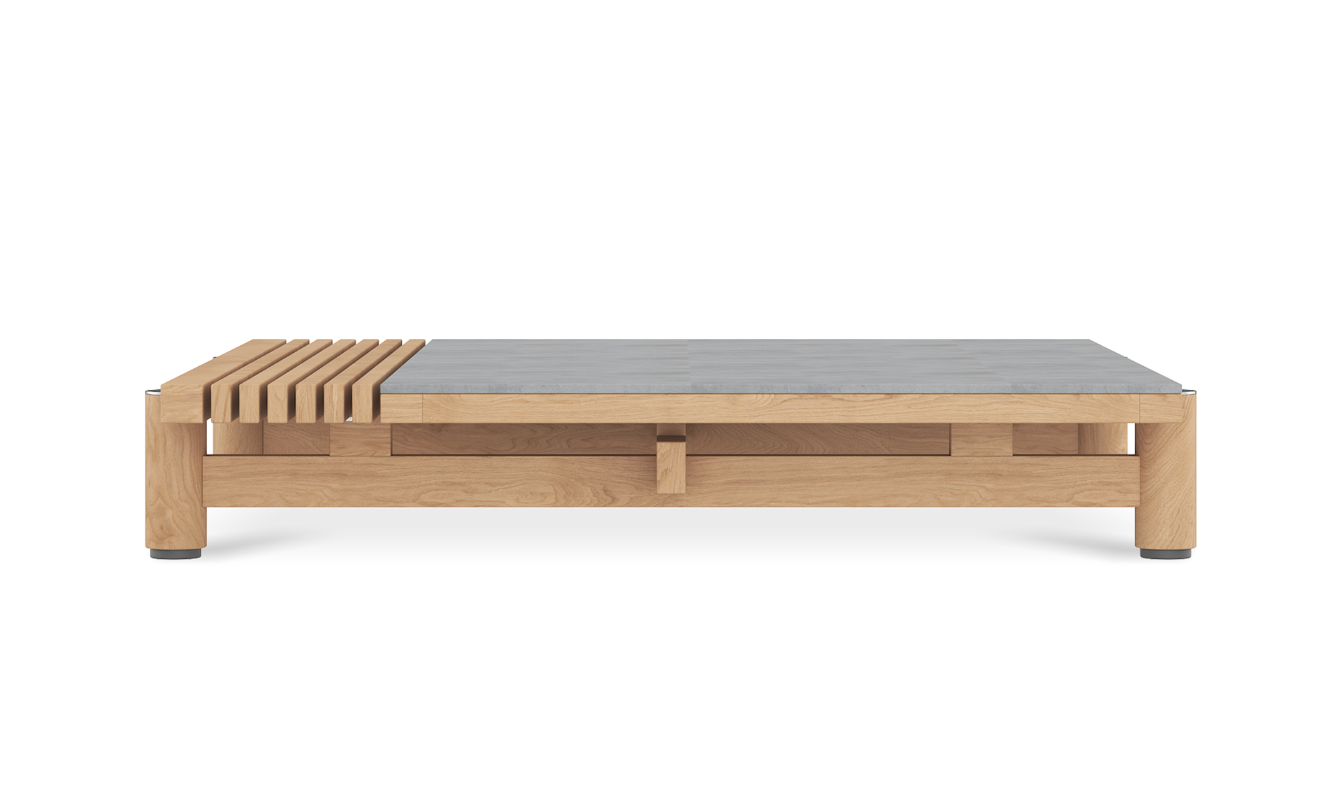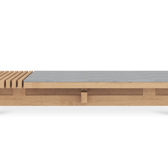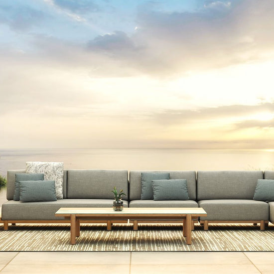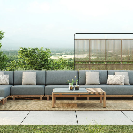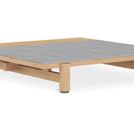 The raul low coffee table brings an architectural edge to outdoor lounging. Half smooth ceramic, half slatted teak, its split-top design is a textural contrast that turns heads and keeps things practical. The solid teak frame anchors the piece with natural warmth, while the low profile makes it easy to pull into your seating arrangement.