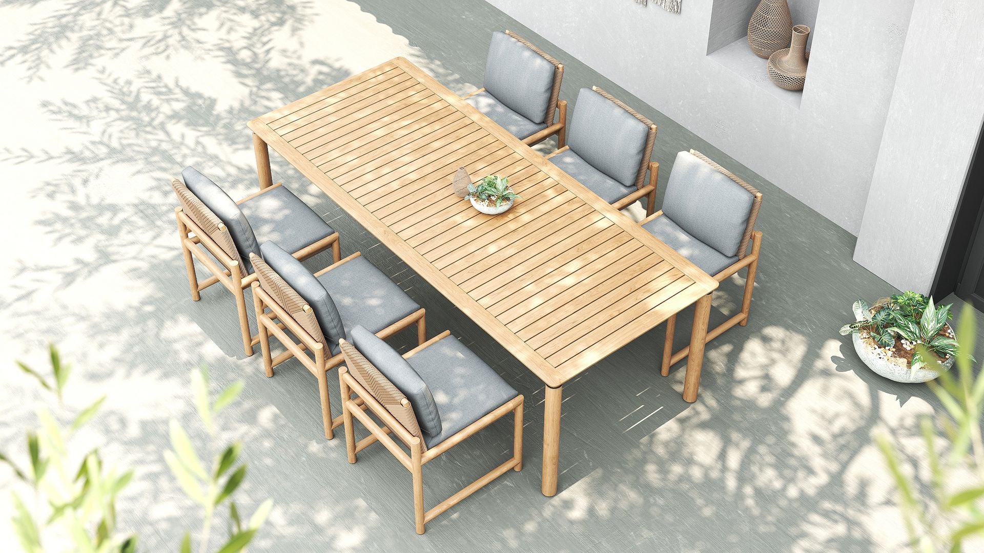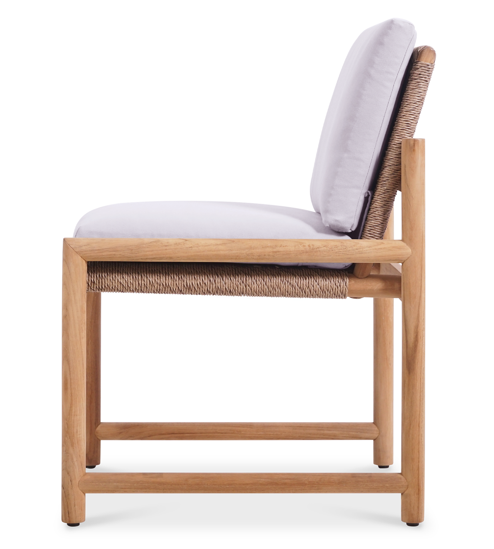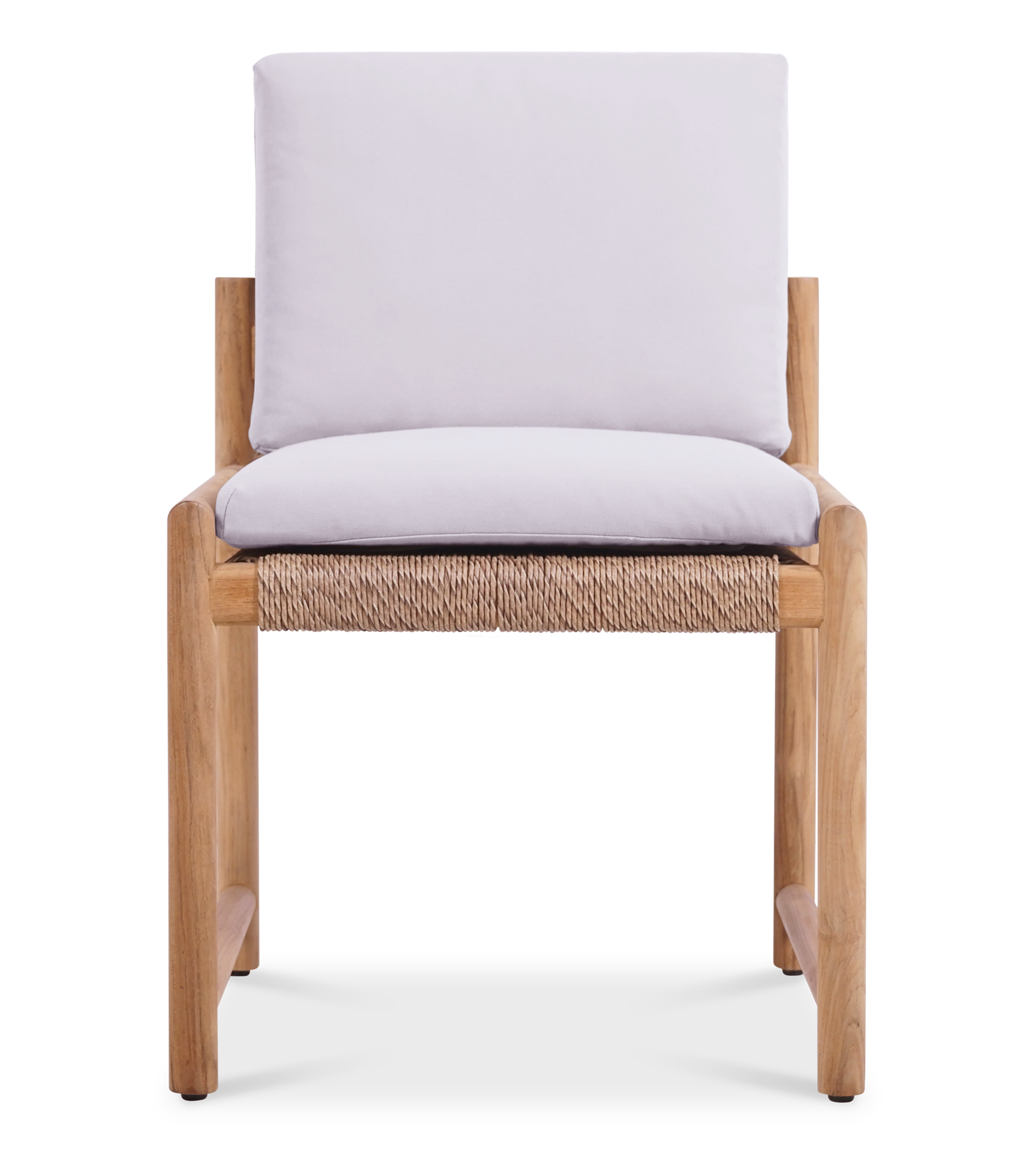 Available with or without arms, the timo dining chair is crafted from solid teak and features a handwoven hyacinth-style wicker back that adds character to any outdoor setting. The supportive frame is balanced by plush cushions that invite long lunches and easy conversations. The armless version tucks in neatly under most tables, while the armchair variation offers extra comfort. Made to withstand the elements, the removable cushion covers come in a range of UV- and fade-resistant outdoor fabrics. A piece that blends timeless appeal with modern durability.