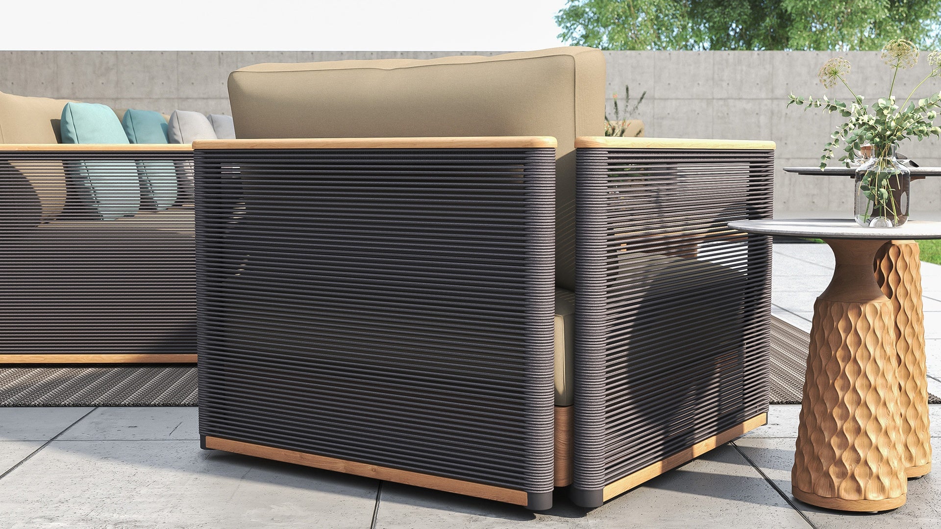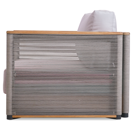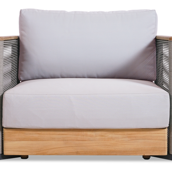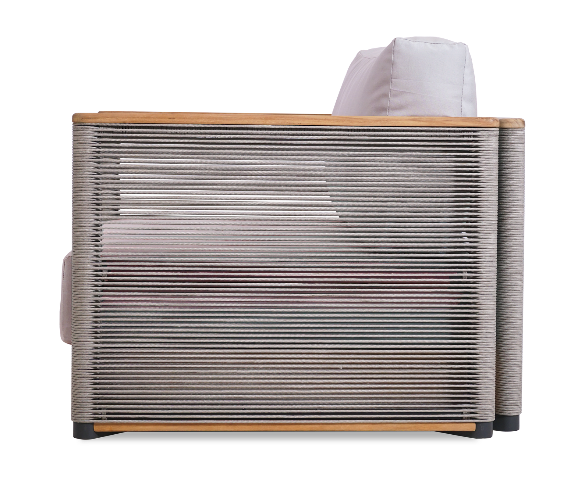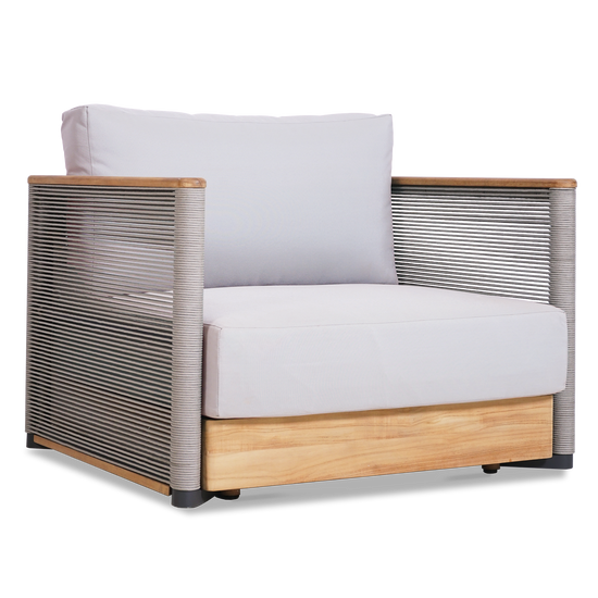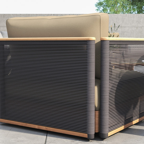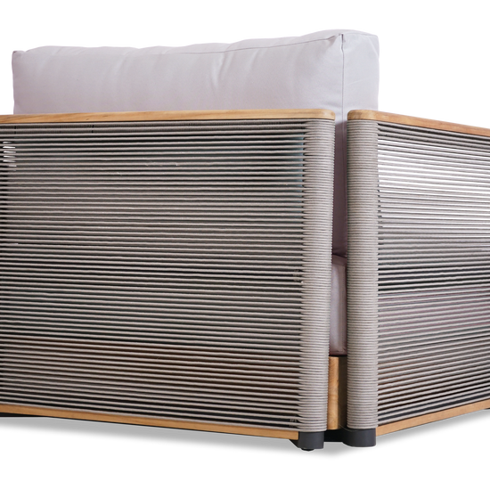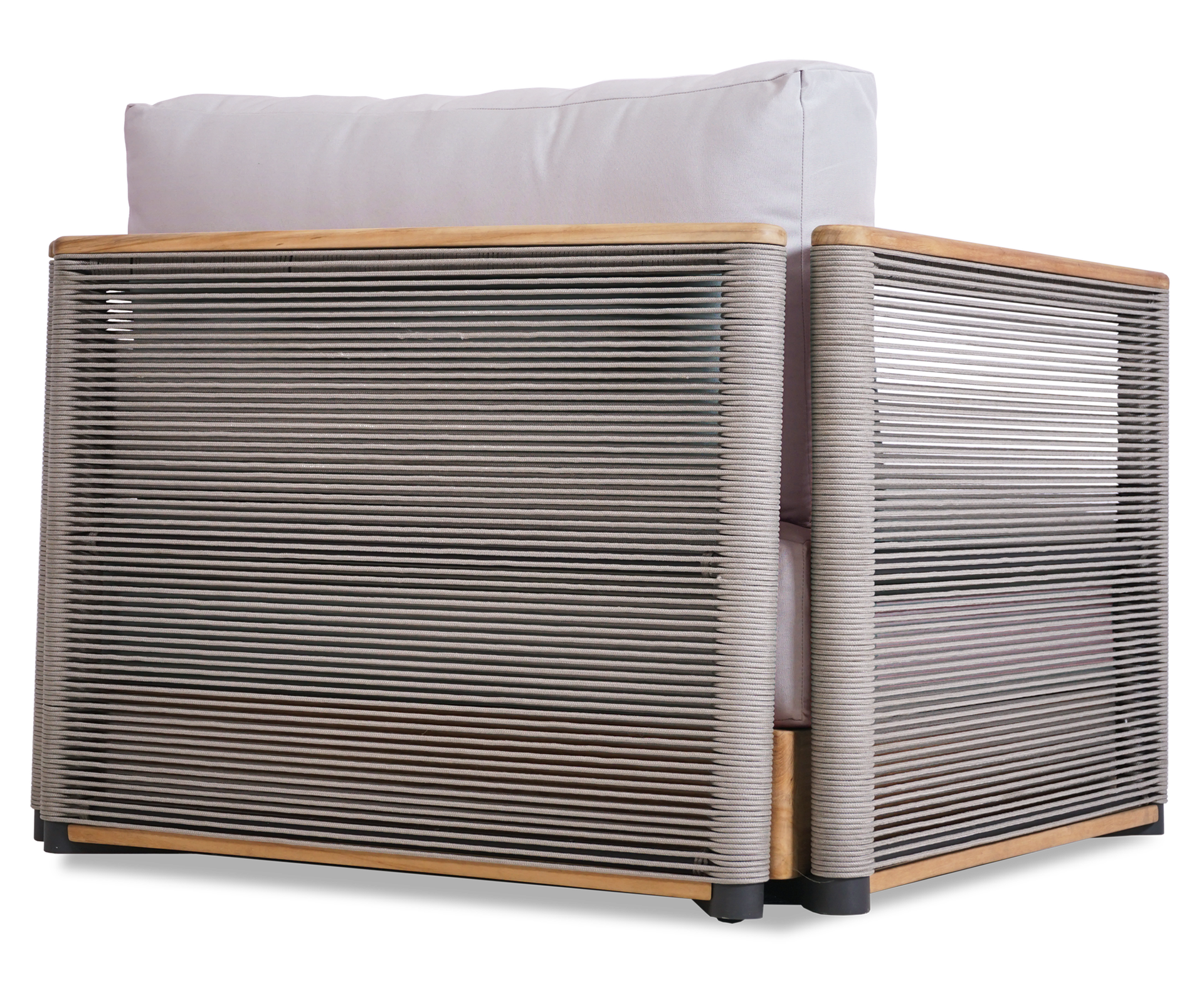 Its handwoven all-weather cord wraps around powder-coated aluminium frames, giving a distinctive texture while keeping things light and durable. The teak detailing adds warmth and refinement, and the outdoor sling beneath the cushion helps with drainage and airflow.
