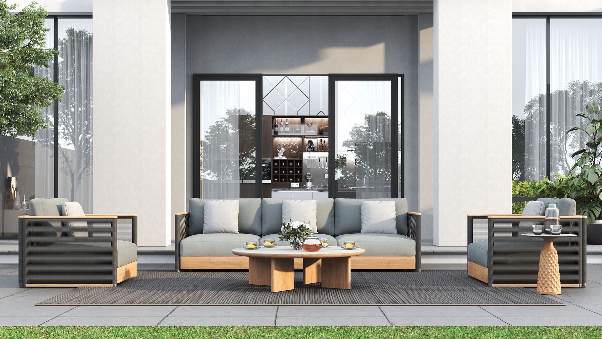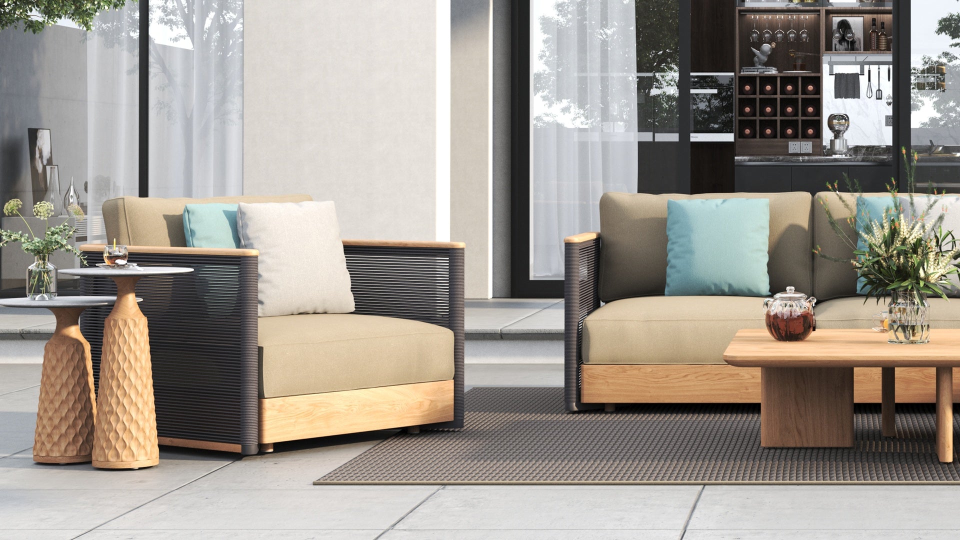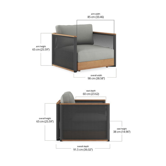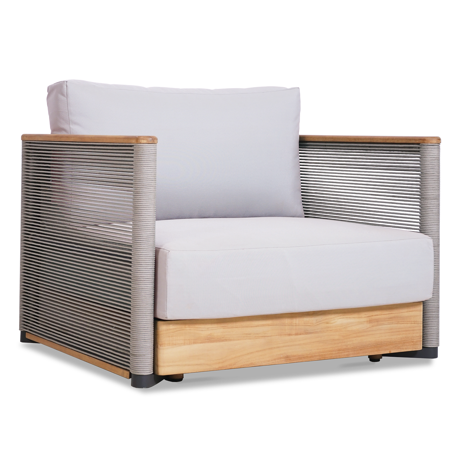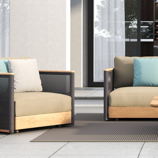 Its handwoven all-weather cord wraps around powder-coated aluminium frames, giving a distinctive texture while keeping things light and durable. The teak detailing adds warmth and refinement, and the outdoor sling beneath the cushion helps with drainage and airflow.