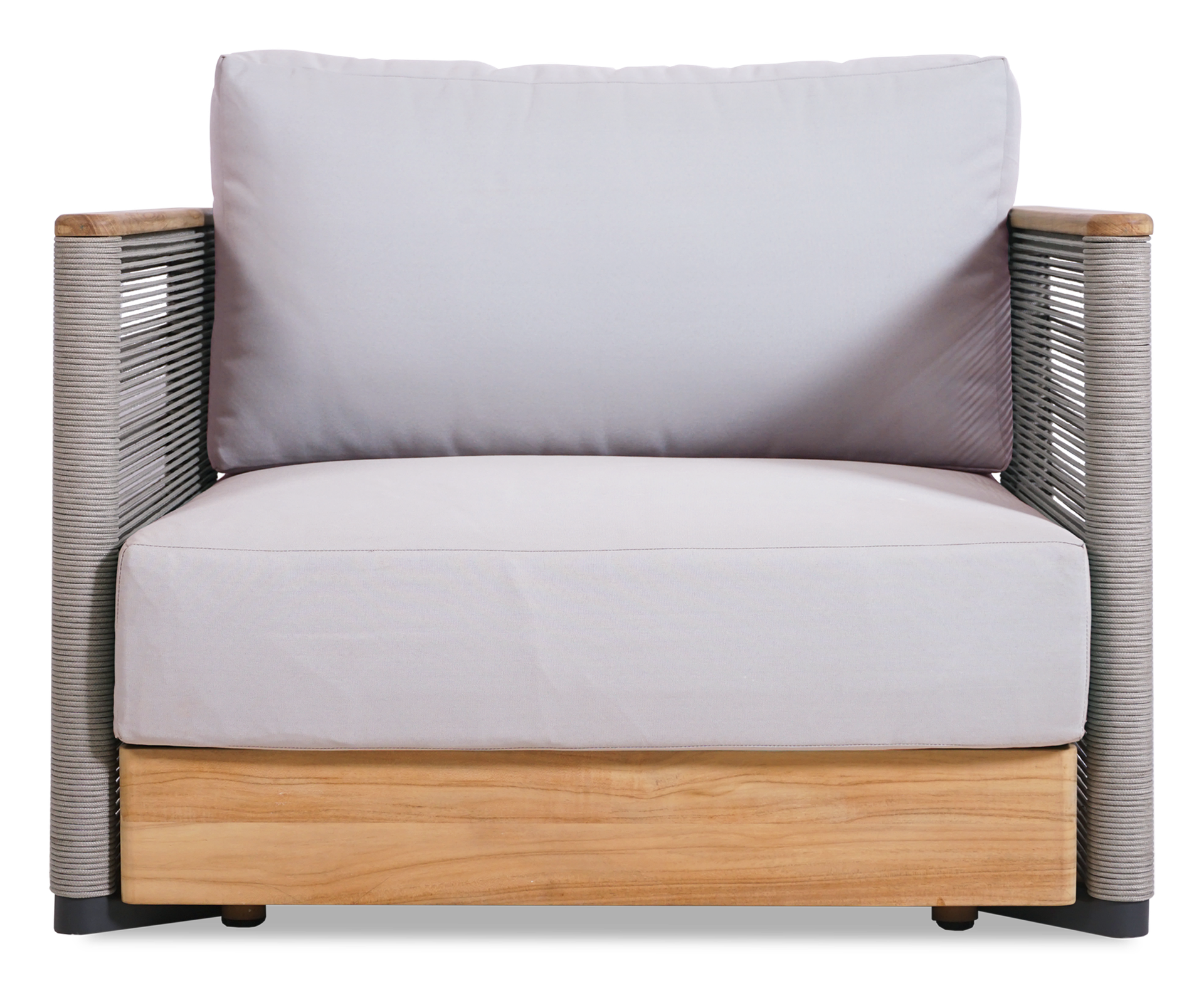 A modern outdoor lounge chair with sharp lines and soft landings. The tora single seater is designed for comfort that doesn’t compromise on looks. It features a supportive high back, plush seat and back cushions, and generous arms topped with solid teak.