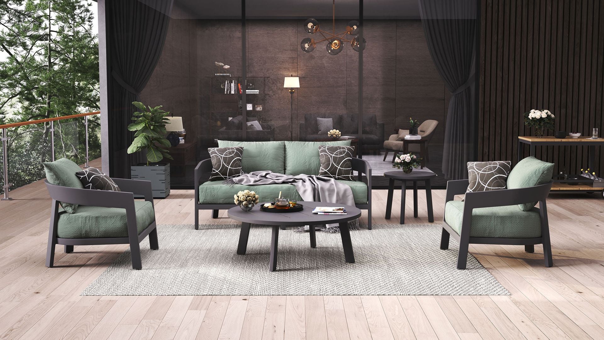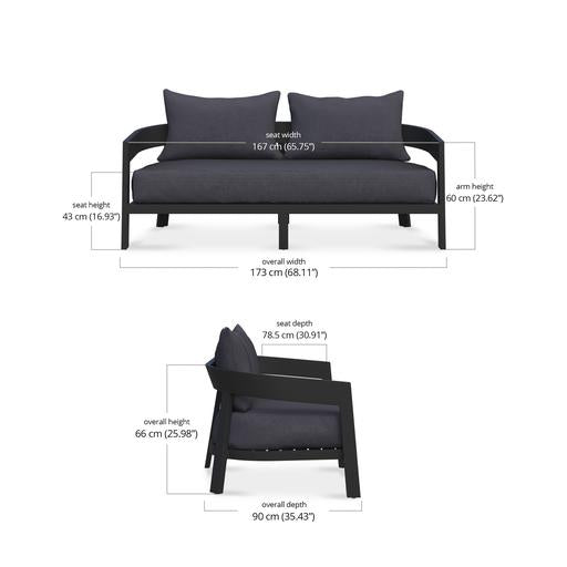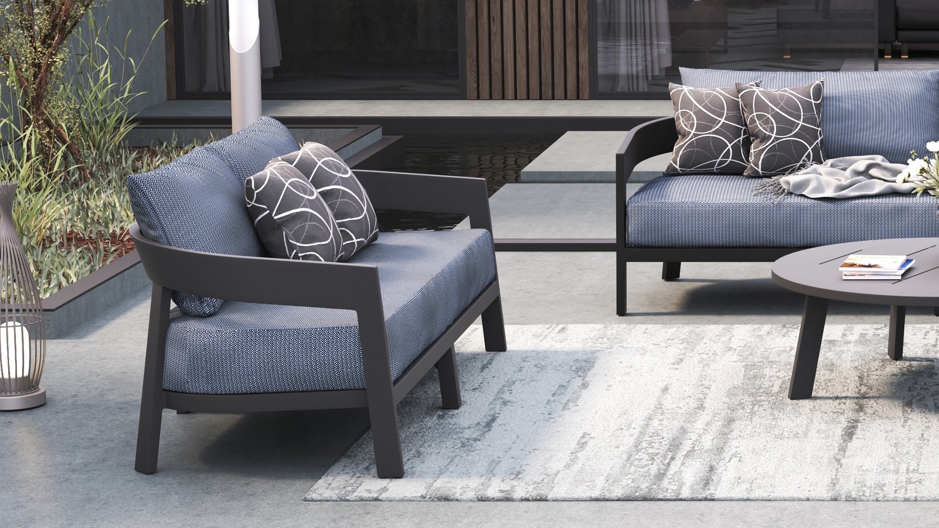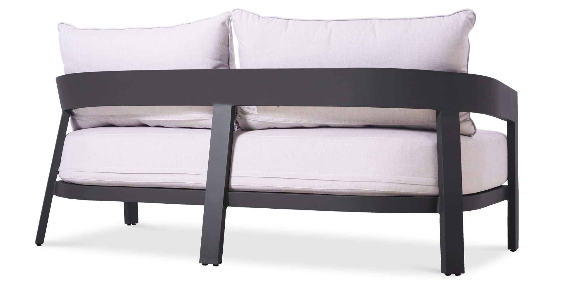 A sleek outdoor sofa crafted with a powder-coated aluminium frame, perfect for coastal or humid climates. The contemporary silhouette combines clean lines with wide proportions for relaxed, modern comfort.