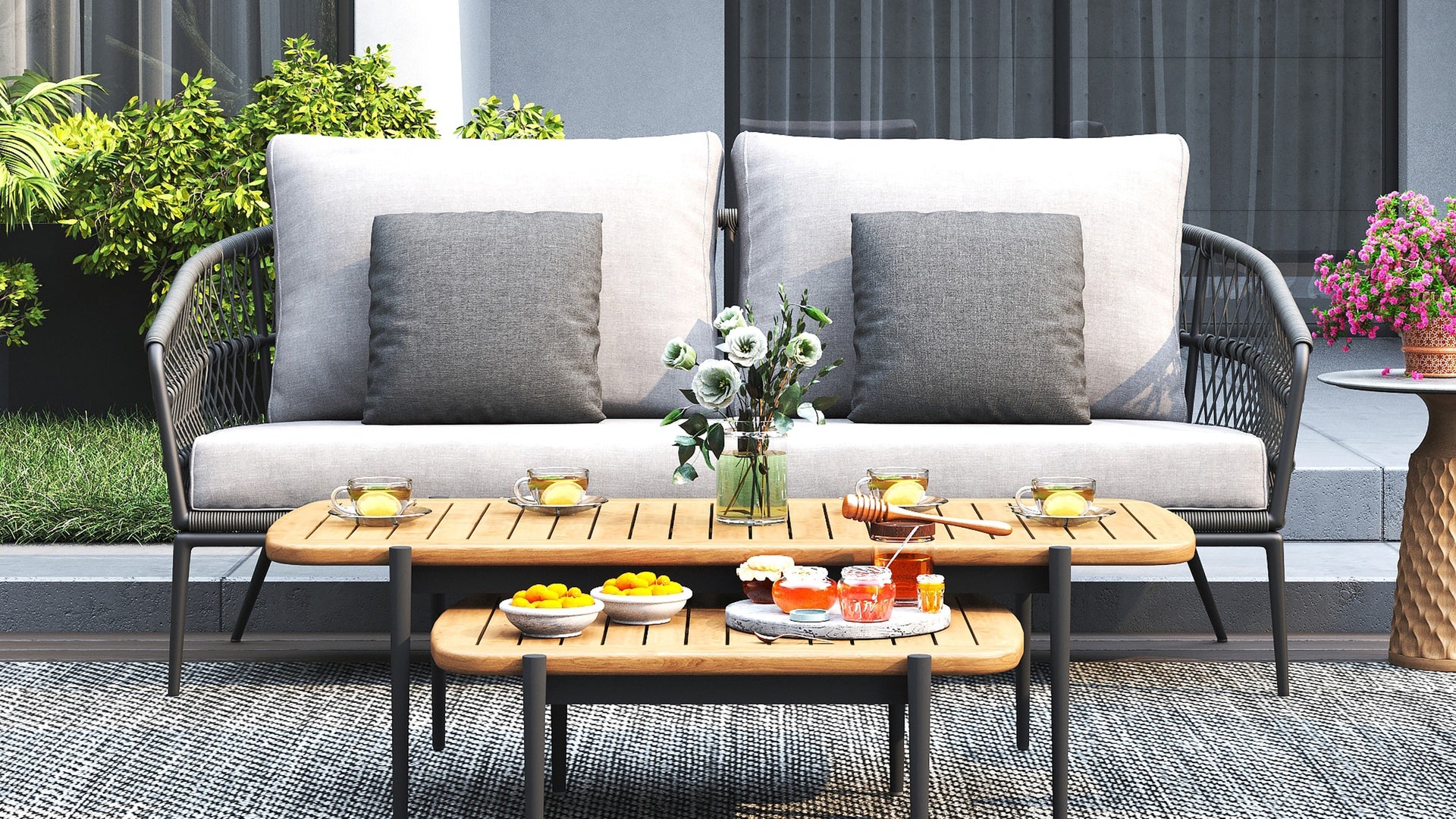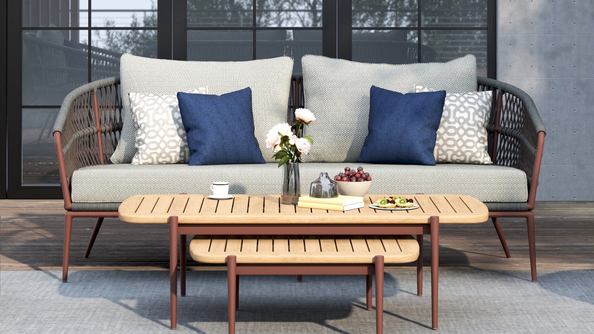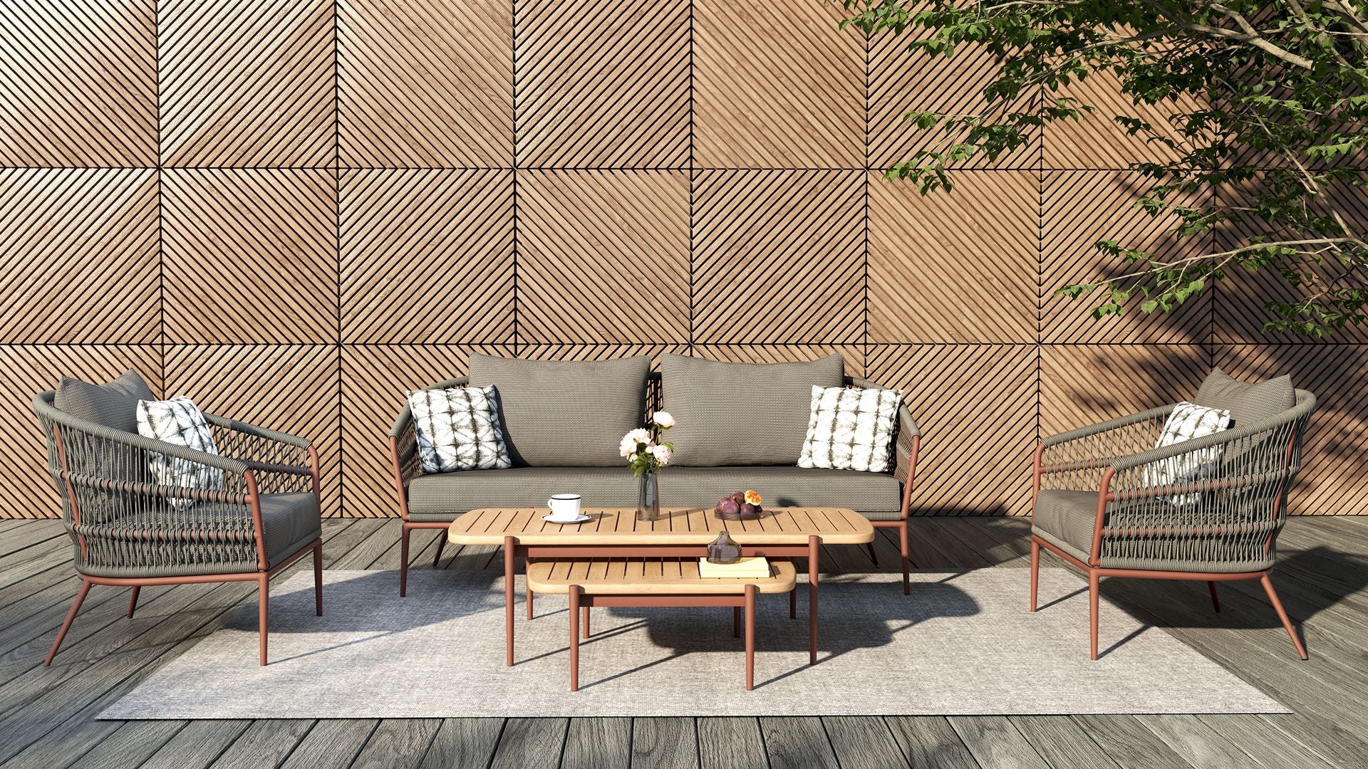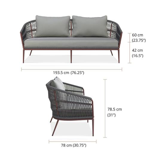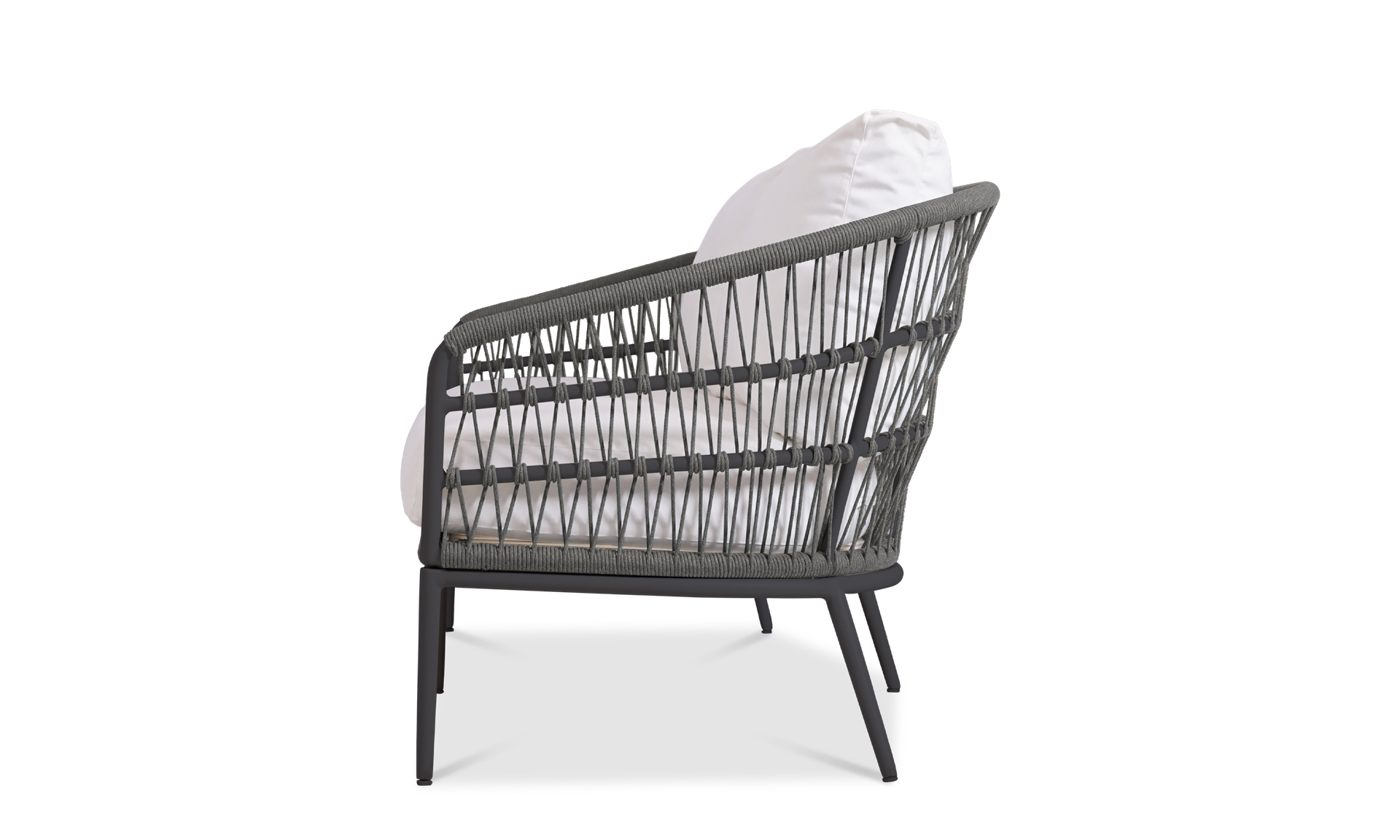 The powder-coated aluminium frame resists rust and corrosion. Weatherproof UV-treated olefin rope adds durability and style. Cushions come with removable, washable covers. This piece is ideal for balconies, courtyards, or poolside lounges. Low-maintenance, stylish, and made for outdoor living.